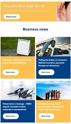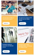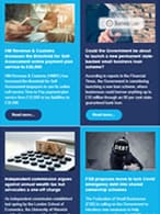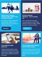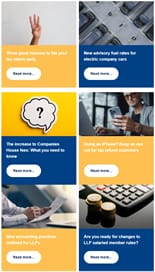 Three great reasons to file your tax return early. New advisory fuel rates for electric company cars. The increase to Companies House fees: What you need to know. Using an iPhone? Keep an eye out for tax refund scammers. New accounting practices outlined for LLPs. Are you ready for changes to LLP salaried member rules?