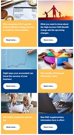 Why companies fail to pay the National Minimum Wage and how to avoid the same mistakes. What you need to know about the High-Income Child Benefit charge and the upcoming changes. Eight ways your accountant can boost the success of your business. The benefits of Employee Ownership Trusts. £56 million overpaid in pension tax. New R&D supplementary information form in effect.