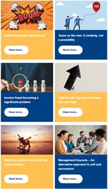 Inside the private equity boom. Taxes on the rise: A certainty, not a possibility. Invoice fraud becoming a significant problem. Total Income Tax and NI income hits new high. What the summer may mean for your business. Management buyouts – An alternative approach to exit and succession.