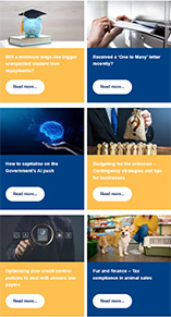 Will a minimum wage rise trigger unexpected student loan repayments? Received a ‘One to Many’ letter recently? How to capitalise on the Government’s AI push. Budgeting for the unknown – Contingency strategies and tips for businesses. Optimising your credit control policies to deal with chronic late payers. Fur and finance – Tax compliance in animal sales.
