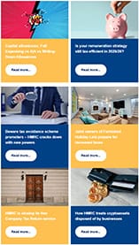 Capital allowances: Full Expensing vs AIA vs Writing-Down Allowances. Is your remuneration strategy still tax-efficient in 2025/26? Beware tax avoidance scheme promoters – HMRC cracks down with new powers. Joint owners of Furnished Holiday Lets prepare for increased taxes. HMRC is closing its free Company Tax Return service. How HMRC treats cryptoassets disposed of by businesses. How to maximise tax relief on losses to offset higher employment costs.